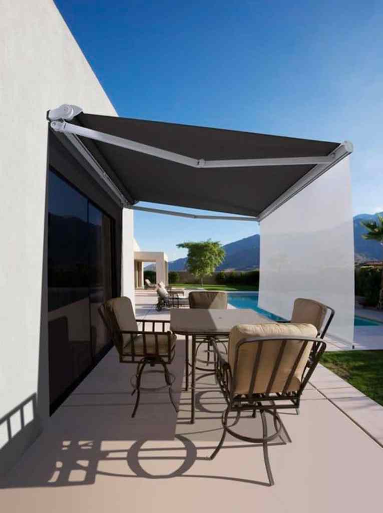 - Caída vertical con ventana se monta en la fachada de tu hogar y se despliega hacia abajo con un sistema de brazos retráctiles. La ventana de plástico cristal, que se encuentra en el centro del toldo, te permite disfrutar de la vista mientras estás protegido del sol, la lluvia o el viento.